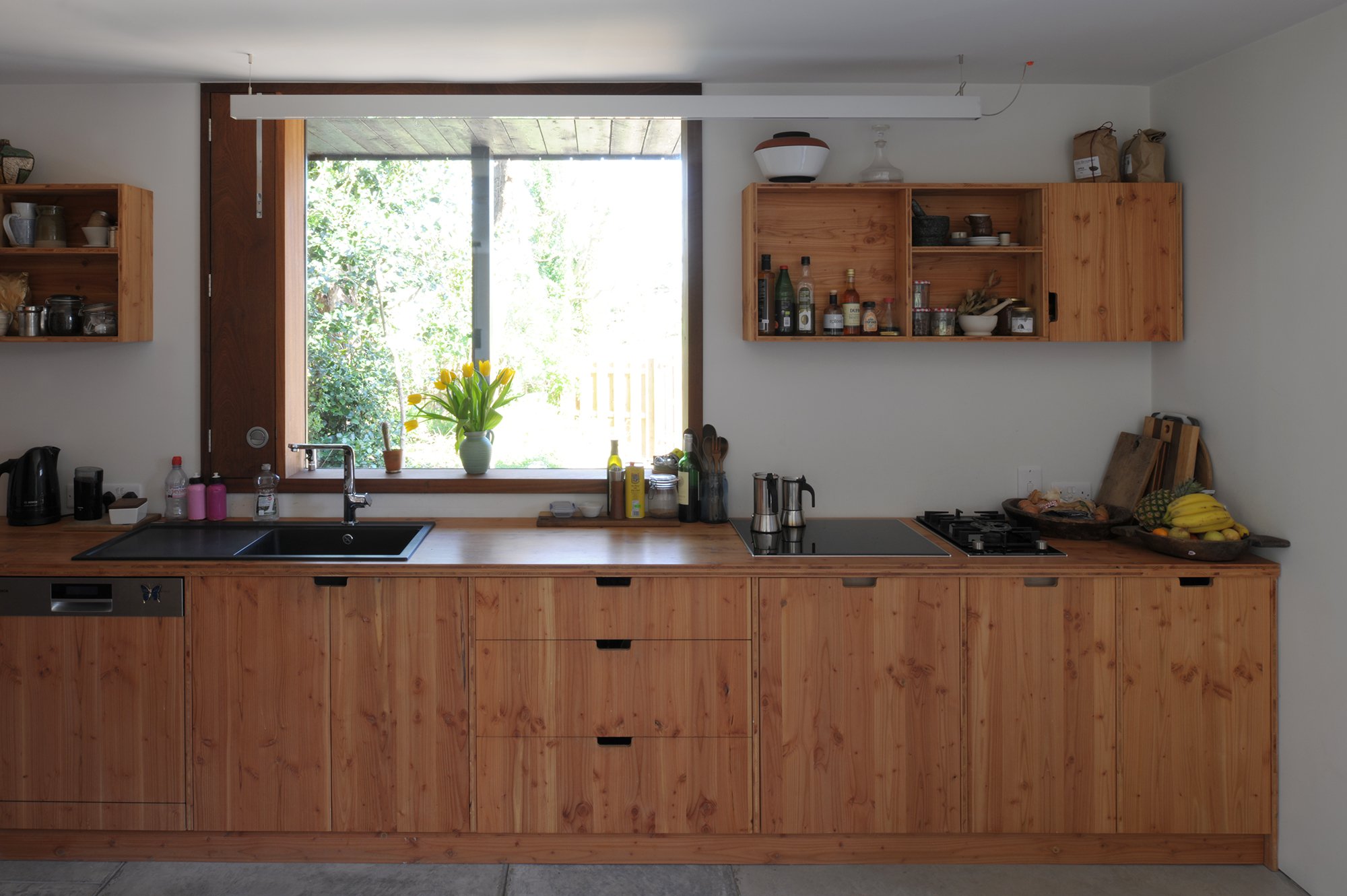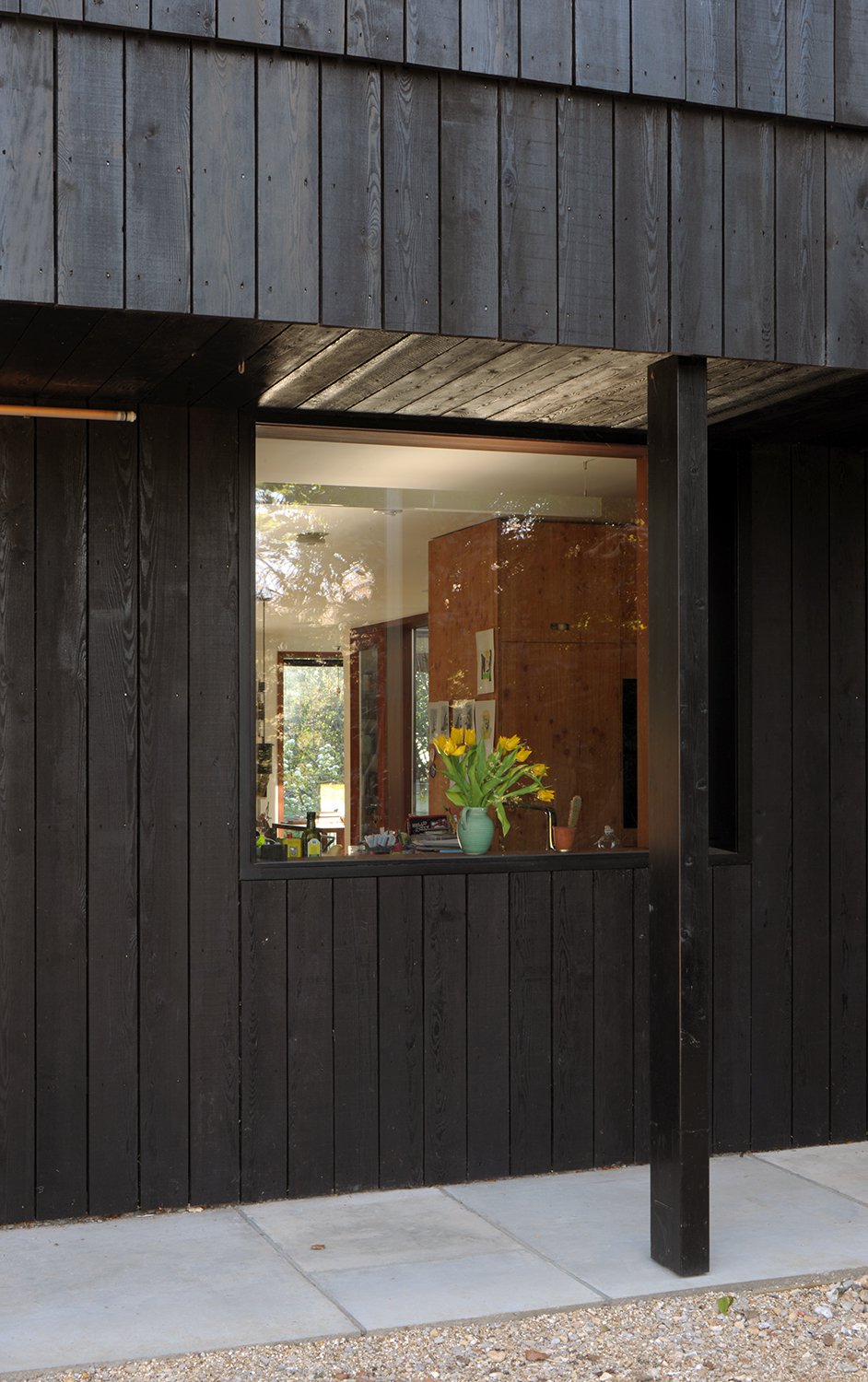 The timber-clad house, completed 2014, is designed as a series of layered spaces that extend into and around the fruit trees, creating deep thresholds between spaces both inside and out. These deep thresholds provide a spatial generosity within the quiet form of the house.