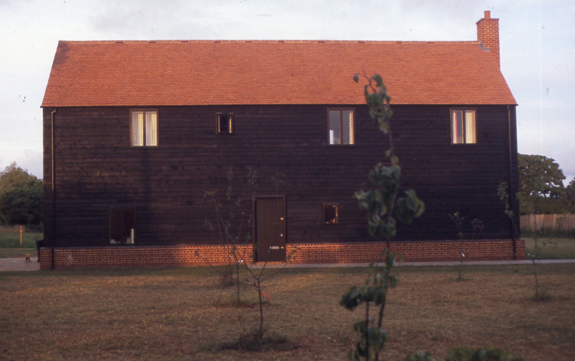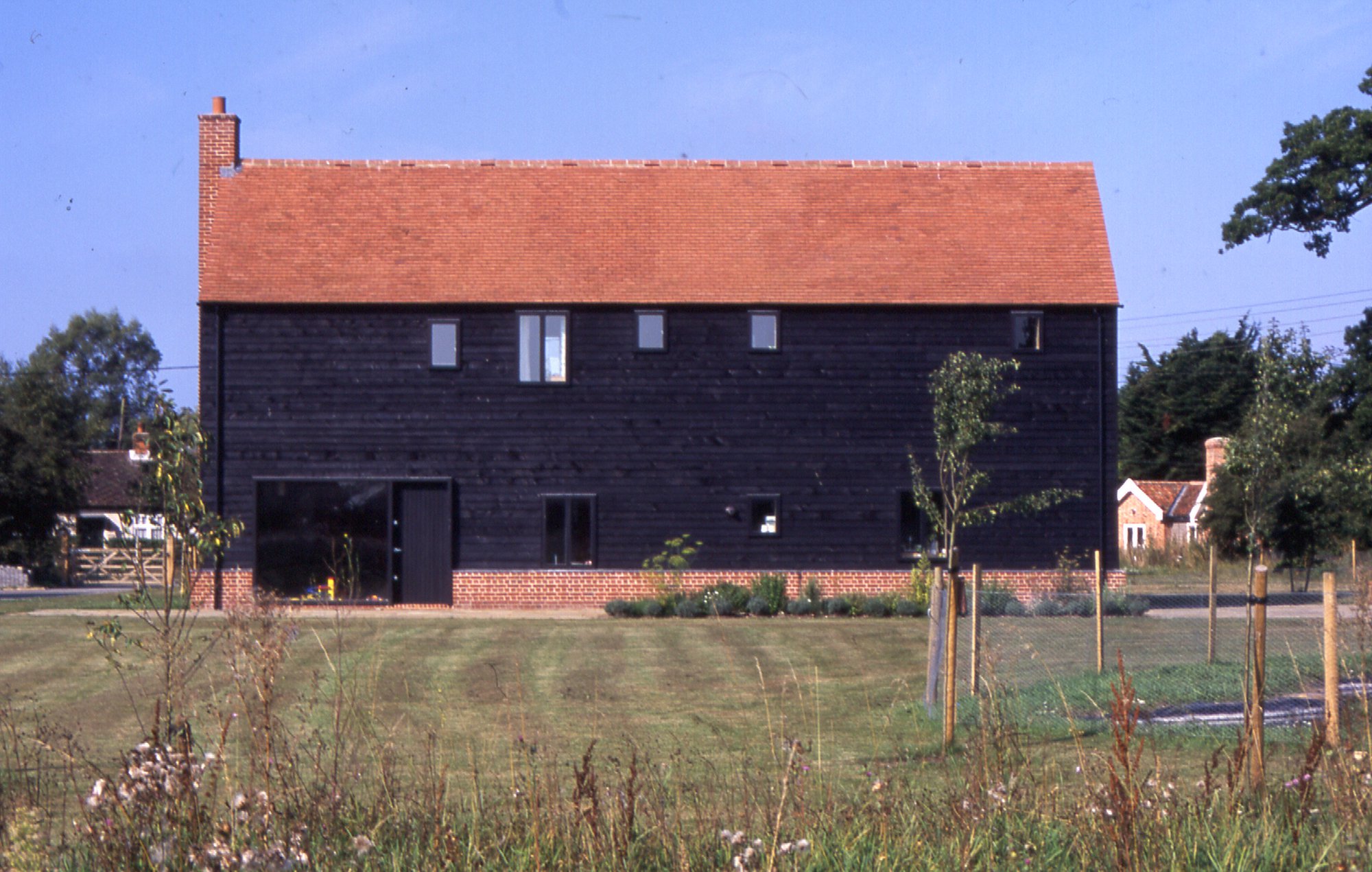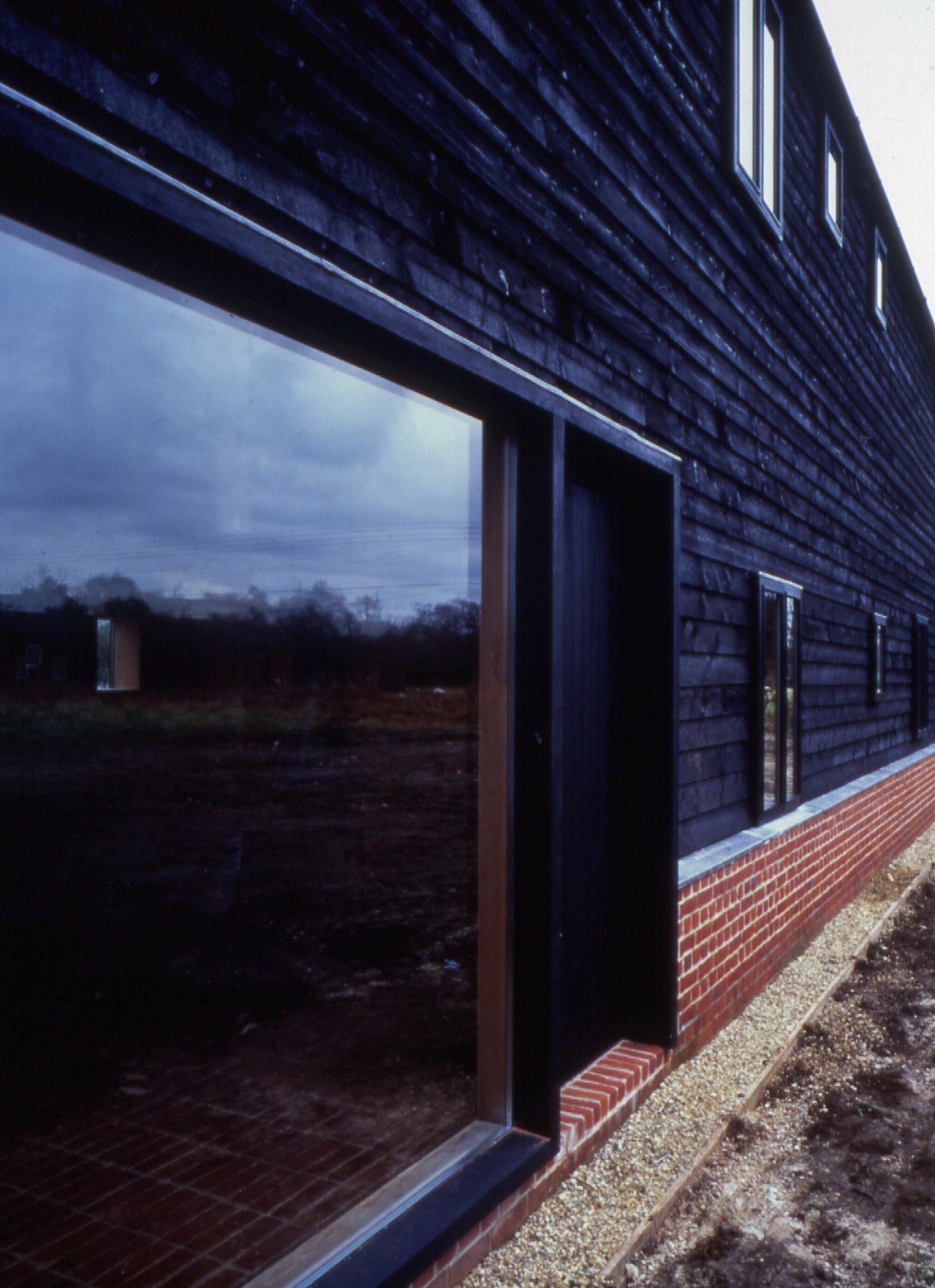 The house is made as a contemporary response to a vernacular way of building. The house sits on a plinth and floor of bricks made of local clay, forming a new ground. The structure above is a timber frame, clad in black weatherboarding, lean and efficient. Windows are pushed to the front of the timber cladding, forming smooth reflective planes. The frames are concealed by the window linings, so that from inside the views are framed like pictures. The restrained choice and use of materials enforce the sense of enclosure within the house.
