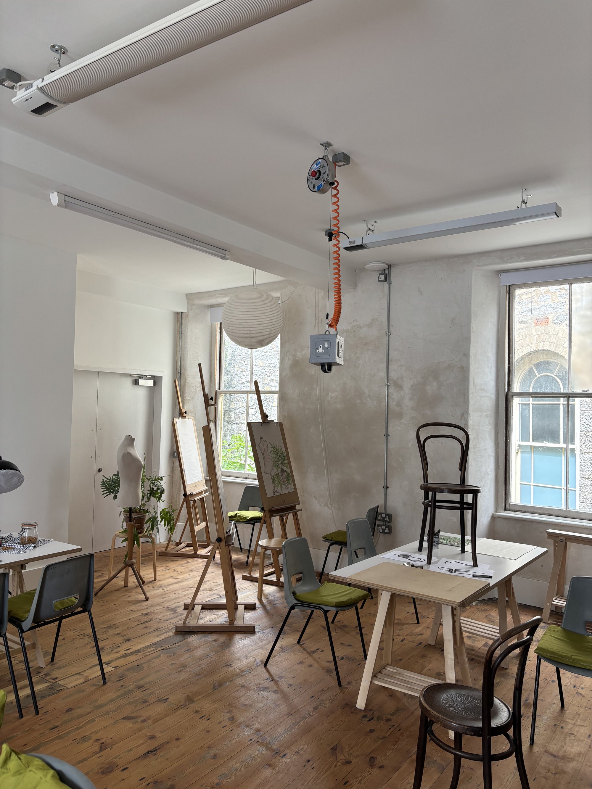 In 2024, we refurbished the School Room to create a public art room, a shared workspace for creative freelancers, and 7 individual artists’ studios. We restored the building fabric and introduced substantial environmental performance upgrades, including using a locally-made insulating lime plaster.
