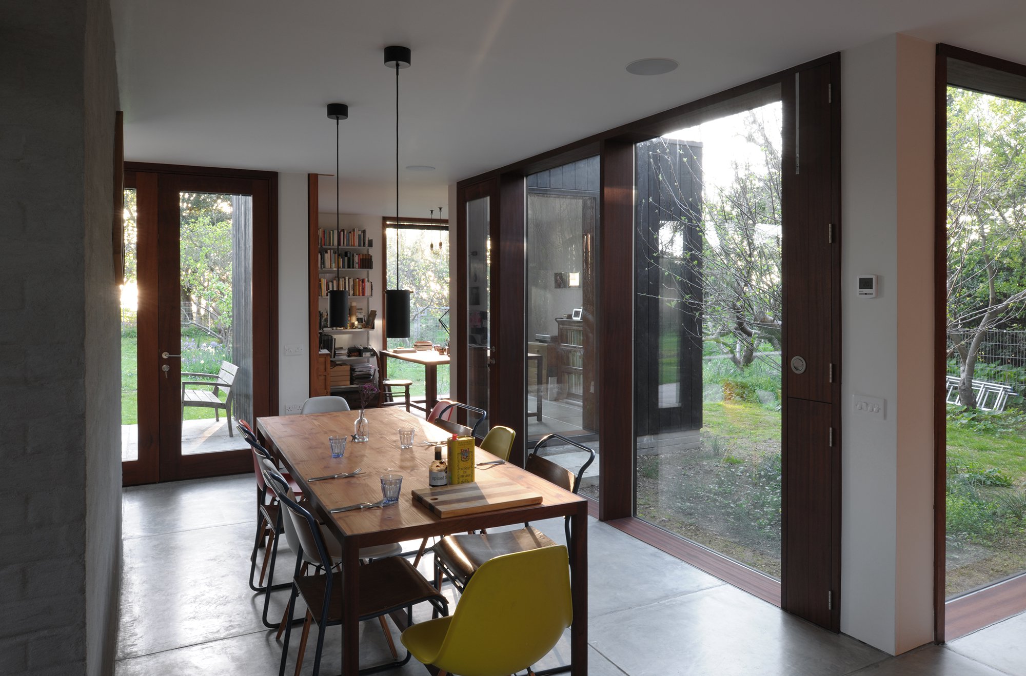 The timber-clad house, completed 2014, is designed as a series of layered spaces that extend into and around the fruit trees, creating deep thresholds between spaces both inside and out. These deep thresholds provide a spatial generosity within the quiet form of the house.